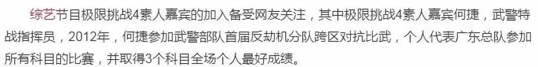 何捷是一名特种兵,曾经上过《一站到底》《极限挑战》等节目↓