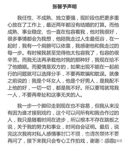 但是这段感情很快就结束了,2013年张馨予发了一纸声明宣告分手。