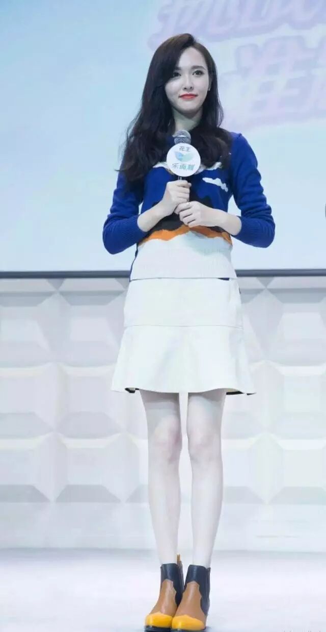 蓝色印花毛衣搭配白色鱼尾裙,甜美又淑女,脚踩拼色短靴,很时尚。