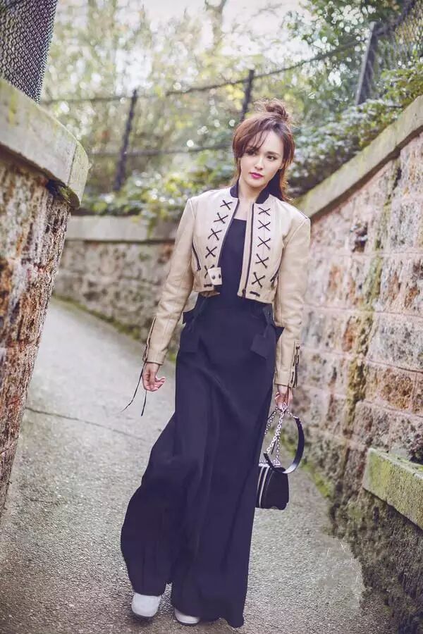 或者换个颜色搭也可以哦,卡其色皮革短夹克,配搭黑色大长裙,腰间特别的设计,既提高了腰线又很时尚, 脚踩白色鞋子,非常清新,半扎丸子头,时尚又可爱。