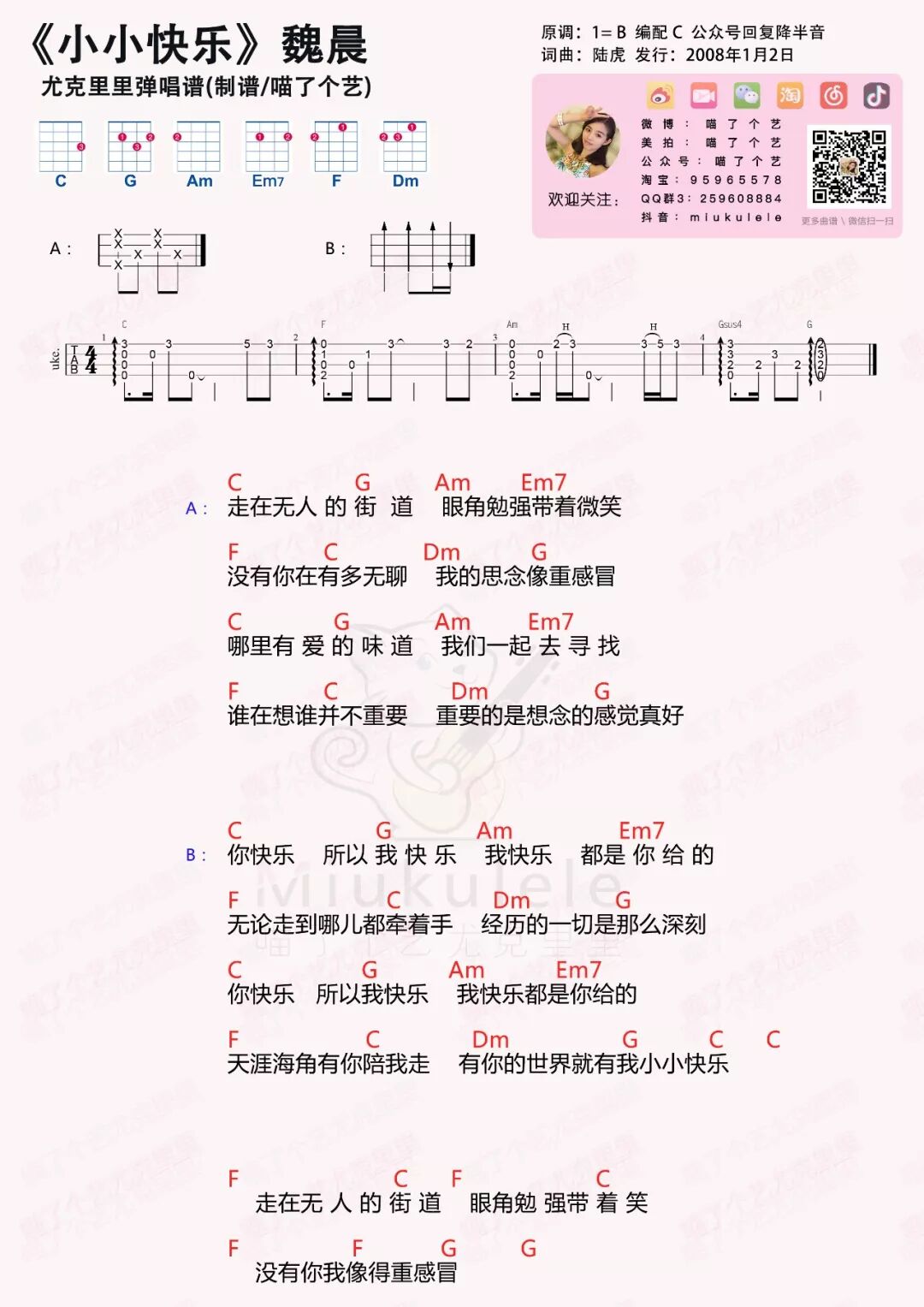 我快乐都是你给的 \ 魏晨 《小小快乐》 | 弹唱曲谱 喵了个艺 内地男星 2018-05-07 22:35:28 358 创作不易,用心坚持,欢迎请BaGua喝几杯爱心咖啡!打赏并支持本文 打赏并删除本文 《小小快乐》是由陆虎作词作曲,魏晨演唱,收录在魏晨的第一张专辑《乐天派》中的一首抒情歌曲。 弹唱曲谱 创作不易,用心坚持,欢迎请BaGua喝几杯爱心咖啡!打赏并支持本文 打赏并删除本文 感谢您的支持鼓励,我会继续努力的!文章地址:用户邮箱:打赏金额:USDT 请输入数字点击”去打赏“,即可进行打赏支持本文章哦 魏晨 About the Author 喵了个艺 功能介绍:尤克里里弹唱\曲谱\教学分享 官方认证:厦门市同安区喵了个艺文艺工作室 Related Posts 超还原版《i believe》尤克里里弹唱 \ 范逸臣版 2022-04-13 22:09:10 曲谱分享: 黄义达《那女孩对我说》说我保护她的梦 2019-08-24 21:40:05 爱你是孤单的心事|蓝又时《孤单心事》吉他弹唱 2019-05-18 23:58:48 曲谱分享:李圣杰《最近》 2019-04-25 22:25:49 陈柏宇《永久保存》 唱得太动听 | 尤克里里曲谱 2019-03-11 22:21:47 发表评论