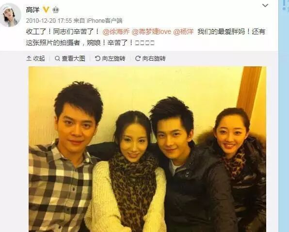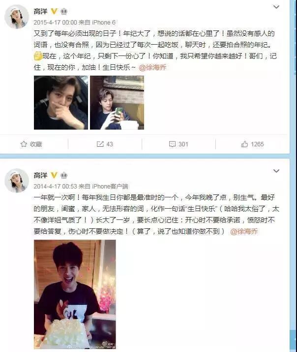 高洋和徐海乔似乎在拍《红楼梦》的时候就结实了对方,至今已有很多年了,几乎每年徐海乔生日,高洋都会雷打不动准时献上祝福,这难道只是记性好吗?只不过近几年不知道什么原因,高洋已经没再继续生日祝福了。