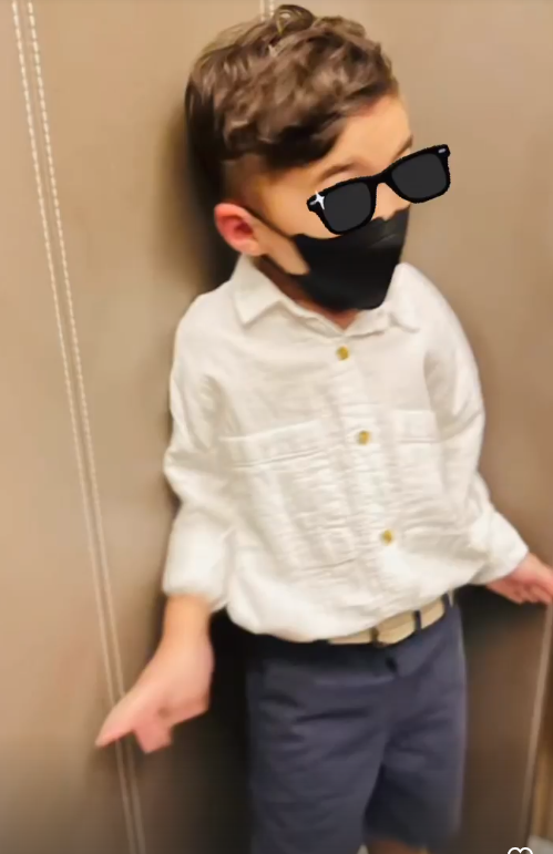 晒出的照片里,罗密欧顶着一头卷发好有型,他穿着白色衬衫搭配深色短裤,两只小手还比出剪刀手的姿势,可爱得不得了。