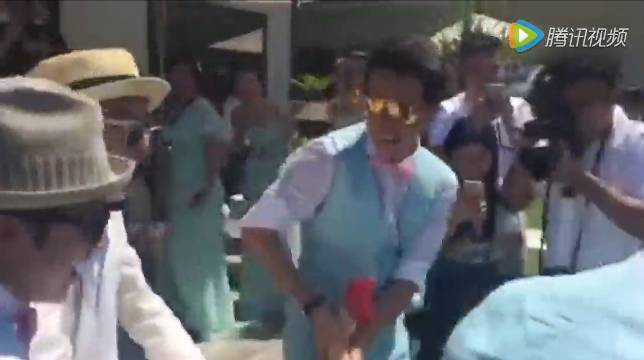 视频一开始,新郎包贝尔首先冲向柳岩,其后伴郎们王祖蓝、韩庚、杜海涛和曾一竣紧跟其后,柳岩被推倒在地。