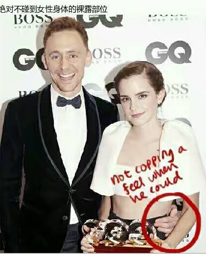 那些说柳岩穿的少活该被摸的人,不妨看看下面这张图。抖森(Tom Hiddleston)在一次红毯上,因为搂着艾玛-沃特森手放在衣服上,而不是裸露的腰部肌肤上,得到了一致的好评,被媒体称为真正的“绅士的品格”。