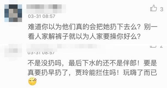 贾玲虽然“腹背受敌”,但还是保护住了死死抱着自己的腰,不想被丢下水的柳岩。并在双方僵持了一段时间后,高喊一声“这件事情很简单,红包就能解决”,结束了这场闹伴娘活动……既保护了柳岩,也给了几个闹事的大老爷们儿一个台阶下。