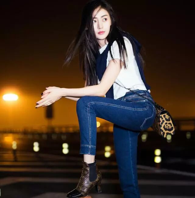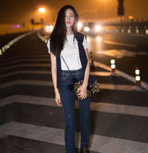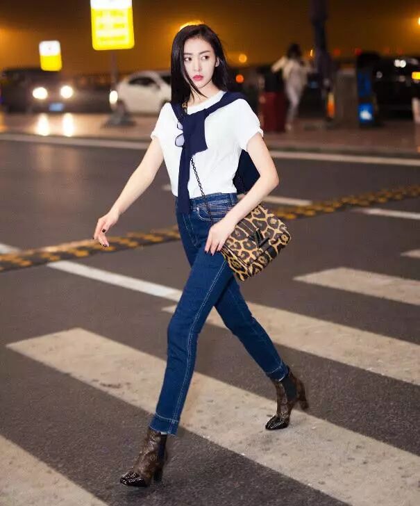 张天爱穿上蓝色的牛仔裤,大方凸显完美的身材比例,脚踩皮靴,走路带风,超级有范。张天爱长了一张杂志脸,就算是简单的T恤配牛仔裤,也穿出超模范,加上好到不行的身材,简直是美到没朋友。