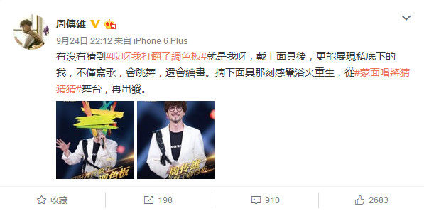 昨天晚上周传雄也是通过自己的微博发文表示将再次起航,他在微博中写道:“有没有猜到#哎呀我打翻了了调色板#就是我呀,带上面具后,更能展现私底下的我,不仅写歌,会跳舞,还会绘画,摘下面具那刻感觉浴火重生,从#蒙面唱将猜猜猜#舞台,再出发。”