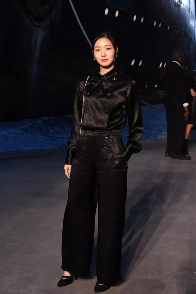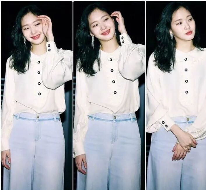 和丁海寅在同框出镜,白色阔腿裤造型颇有几分强势,但是她机智的用半透视以及缎面的组合增强了柔美感,再加上透亮的嘟嘟妆容,简简单单就很出彩。