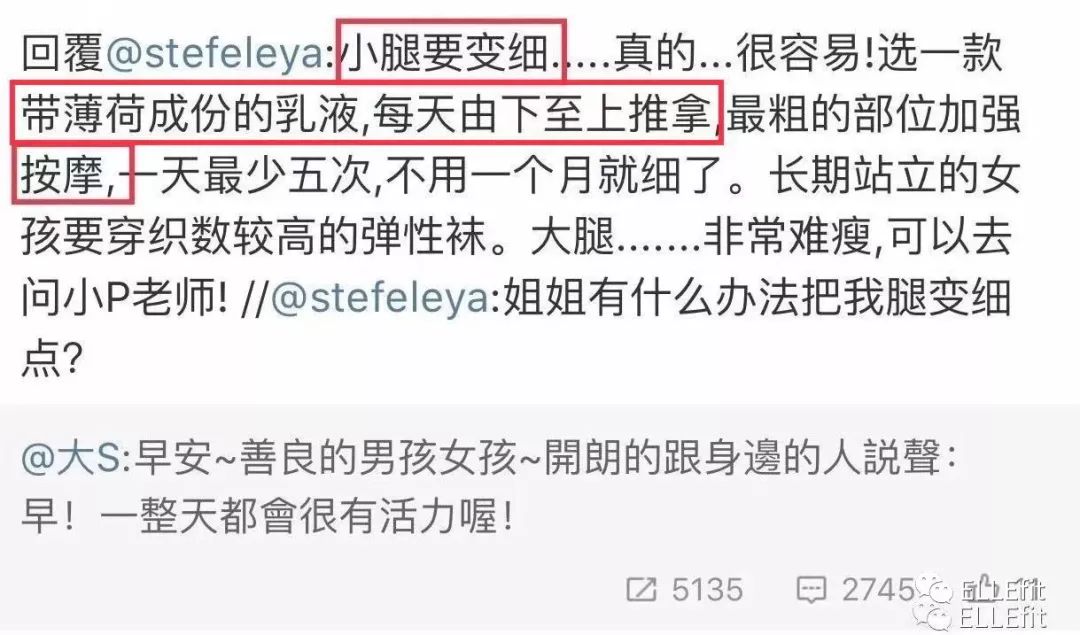 不光是小S,姐姐大S也非常喜欢按摩小腿,曾经在微博上回复粉丝可以用带薄荷成分的乳液每天进行推拿。