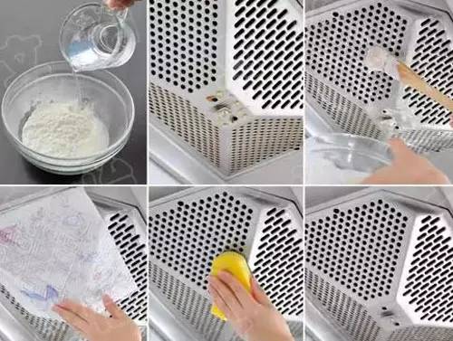 面粉中倒入温水,调成面糊即可,用刷子将面糊刷在油烟机油网上。用厨房纸贴在油网上。大约5分钟之后将厨房纸揭下,最后用抹布擦拭,轻松搞定!