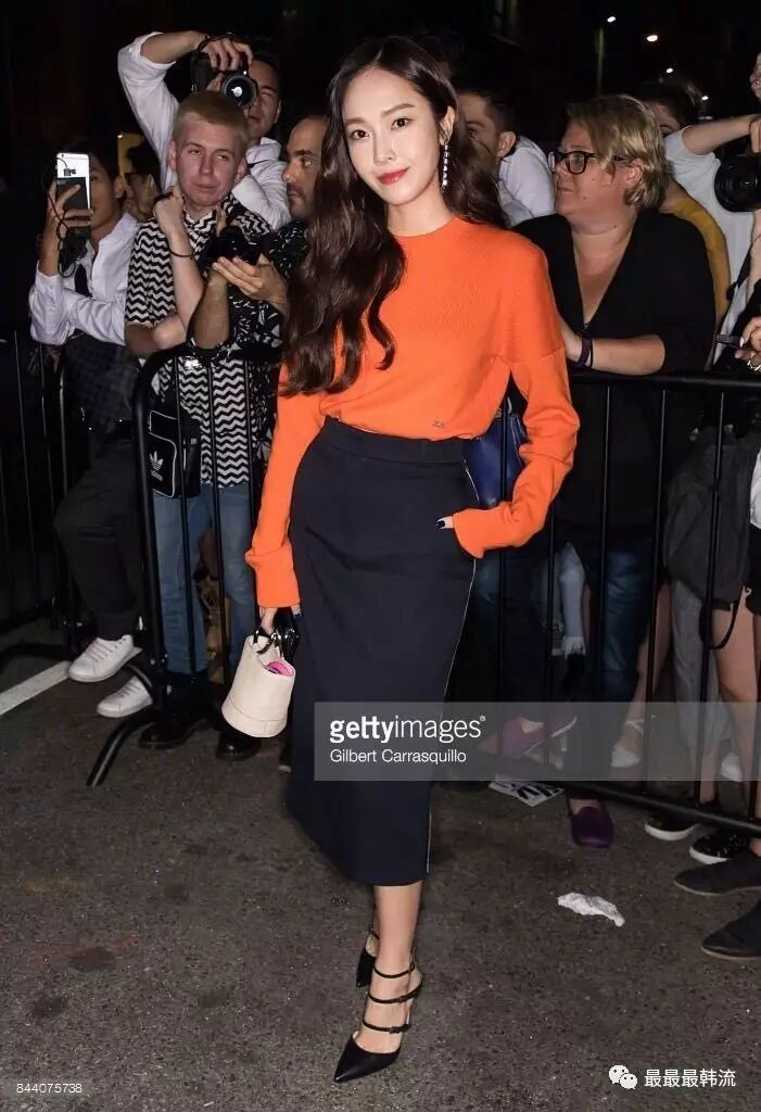 橘黄色是秋天必不可少的一个颜色,这几周好多人都选了这个颜色。郑秀妍的橘色毛衫和黑裙子来自于CK,白色手包来自于SIMON MILLER。
