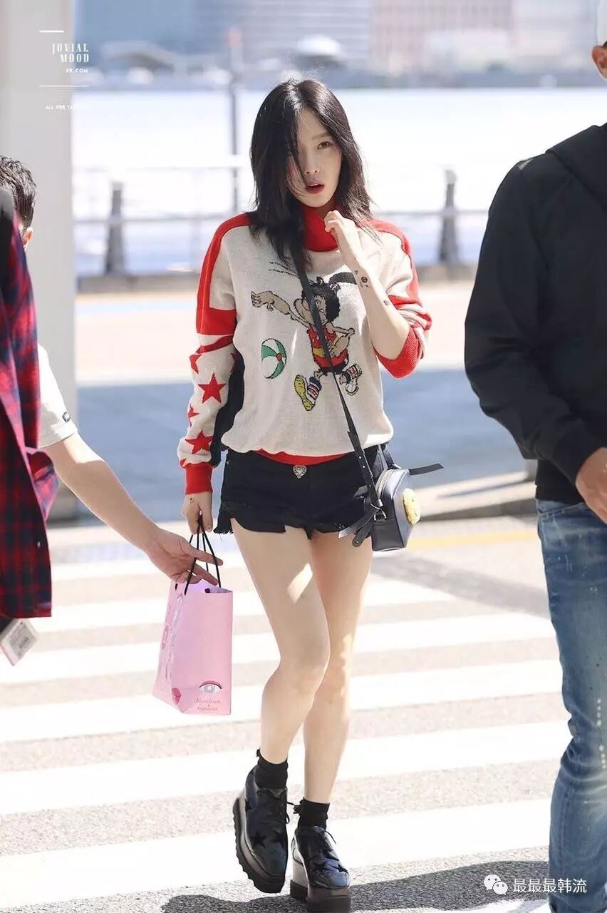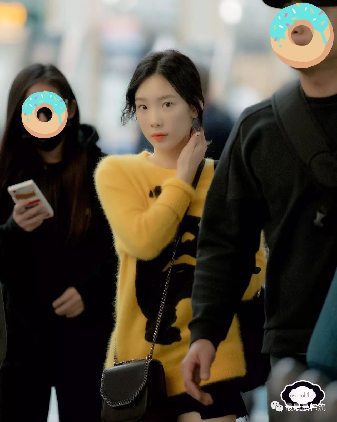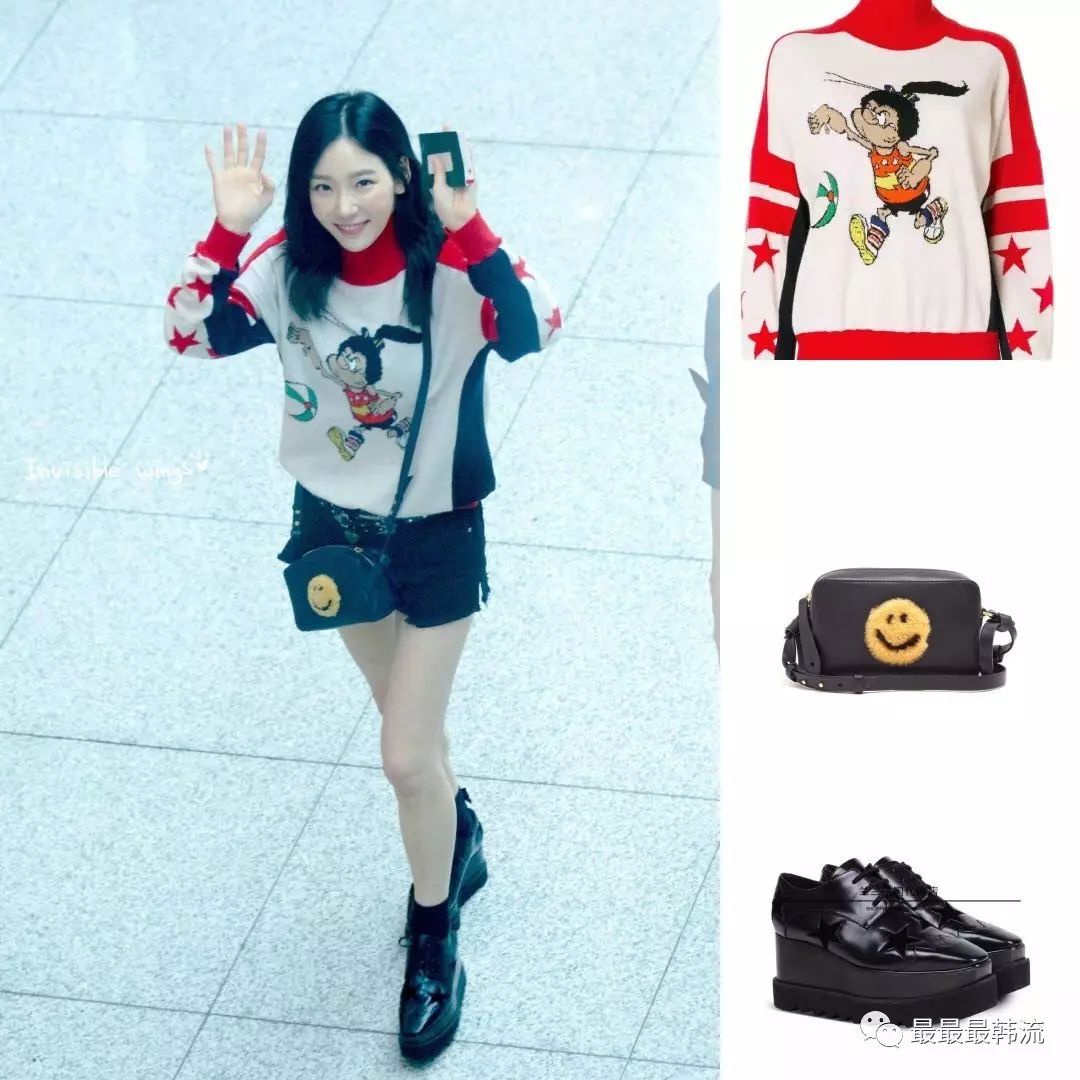 泰妍的卫衣来自Stella McCartney,笑脸包包来自Anya Hindmarch,鞋子同样来自Stella McCartney。