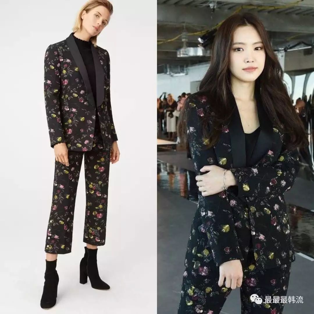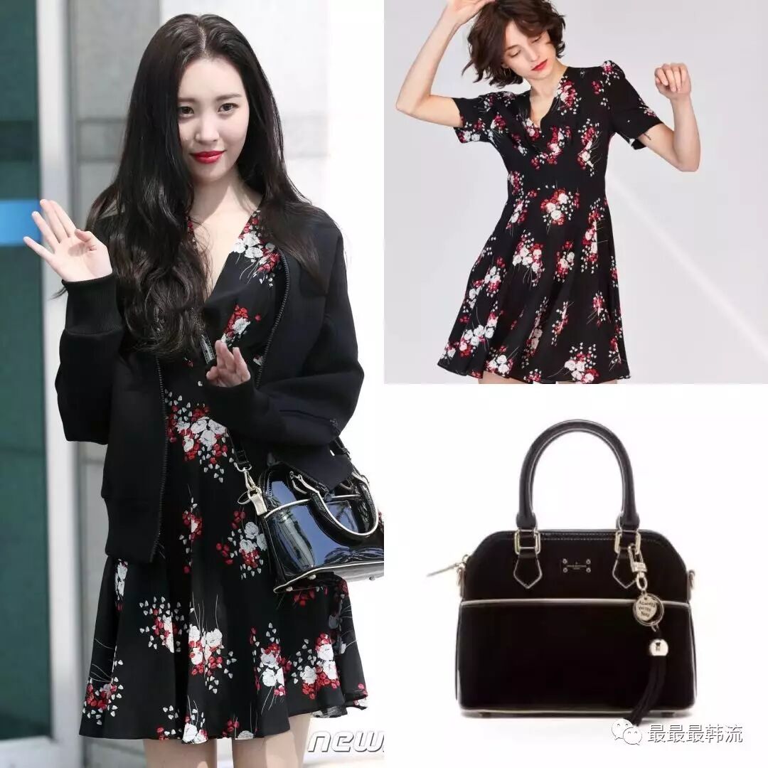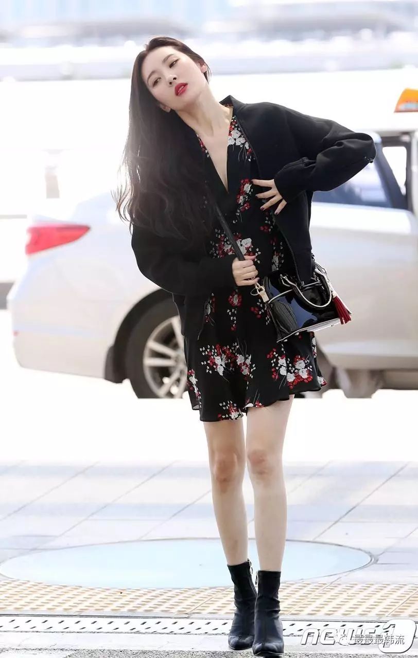 碎花裙子+黑外套+黑包+黑靴的组合这几周好多女明星都会这样选择。宣美把皮衣换成了黑外套会显得更温柔,喜欢有一些酷的就选皮衣咯。