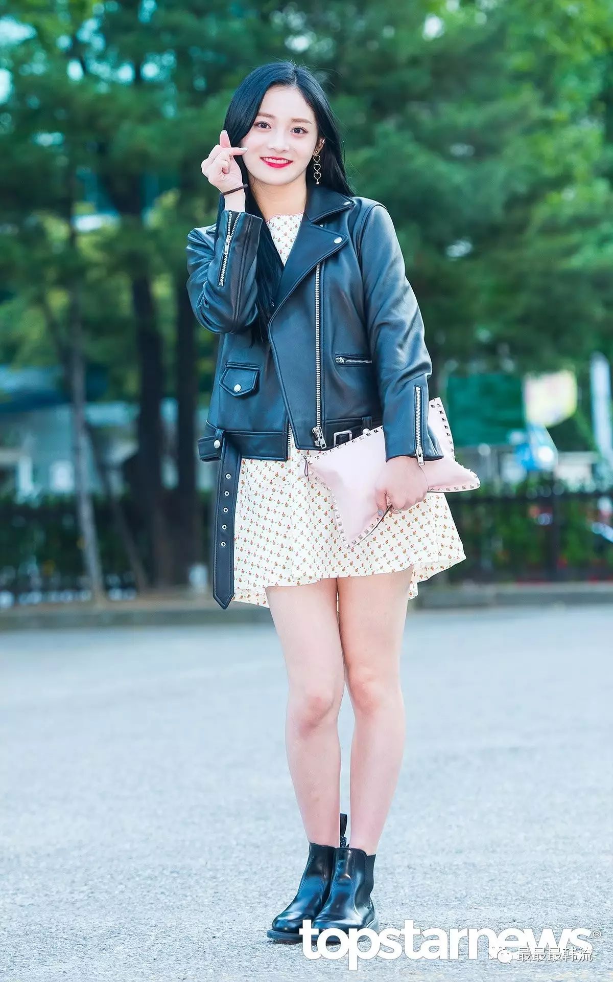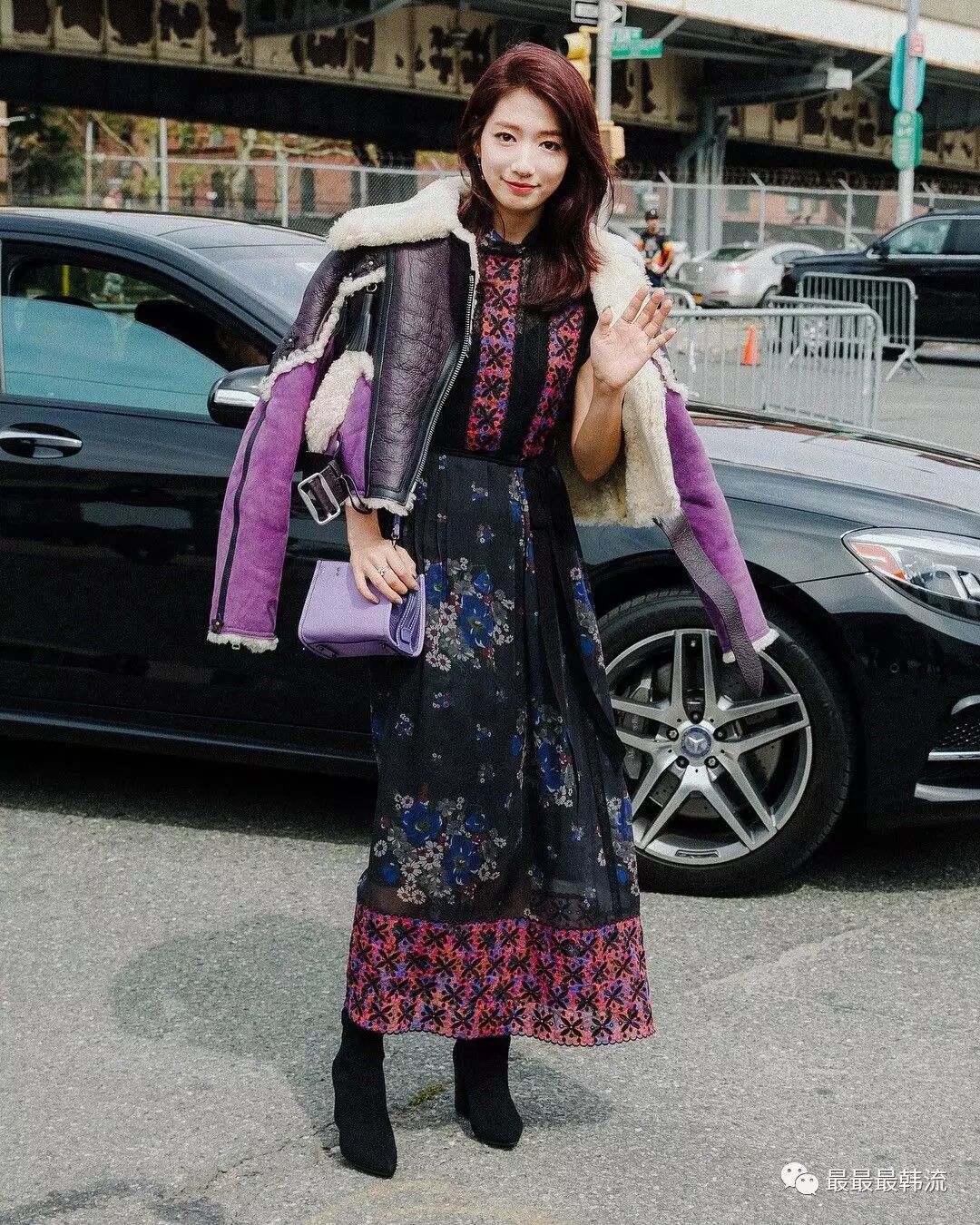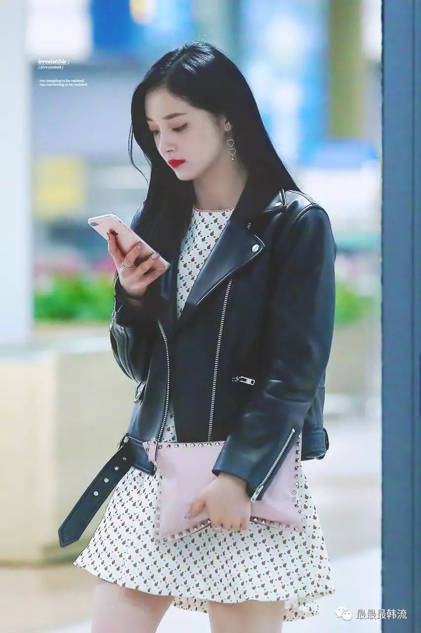 碎花裙子+黑外套+黑包+黑靴的组合这几周好多女明星都会这样选择。宣美把皮衣换成了黑外套会显得更温柔,喜欢有一些酷的就选皮衣咯。