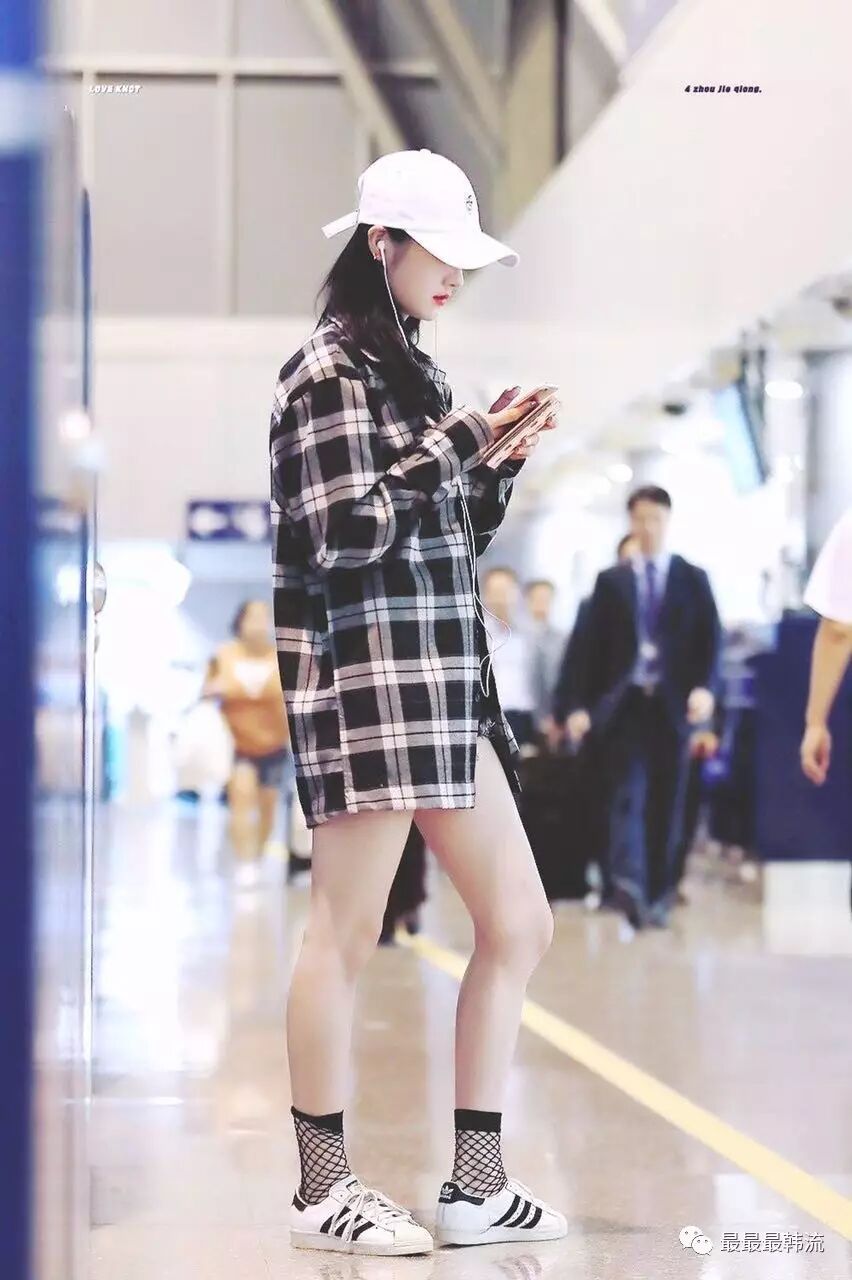 周洁琼的另一套look是格子衬衫,白帽,阿迪运动鞋。