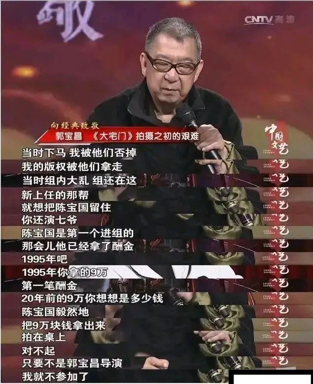 身为男主的陈宝国听说了,当即把投资商提前支付的9万块钱片酬拍在桌子上,说:“对不起,只要不是郭宝昌导演,我就不参加了。”