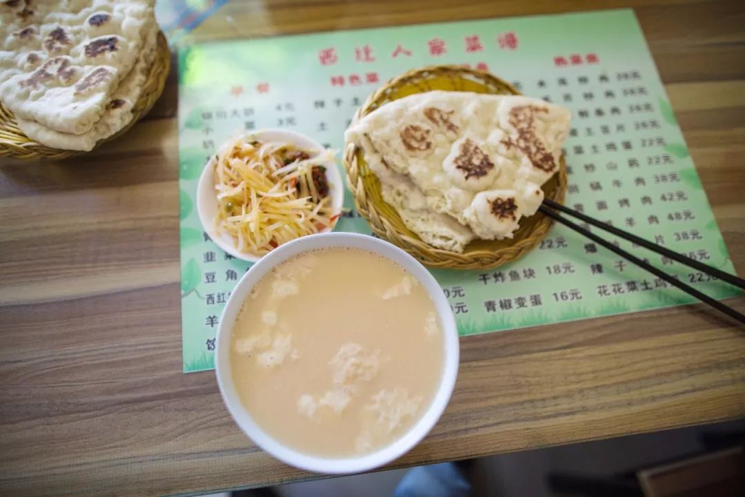 新疆人家的奶茶都是直接买牧民家的鲜牛奶慢慢熬煮,咸口的居多,尤其是牧民家庭,奶茶就馕也是一道标准的新疆早餐。