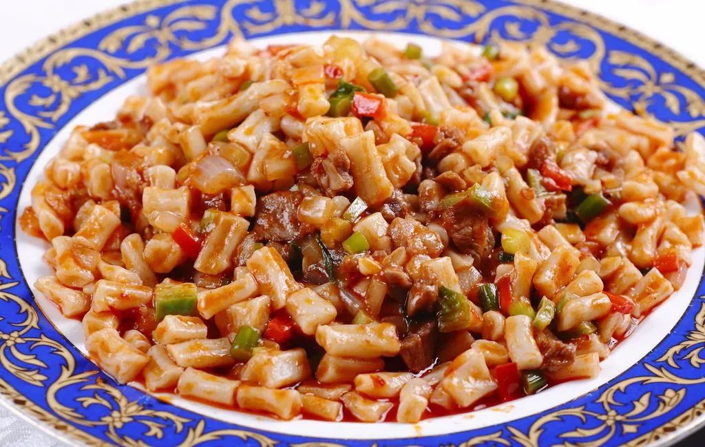 拉条子改刀,加上蔬菜牛羊肉同炒,就变成了热辣入味的丁丁炒面。