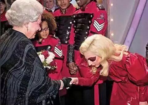 她穿着红色乳胶裙接受英国女王伊丽莎白接见