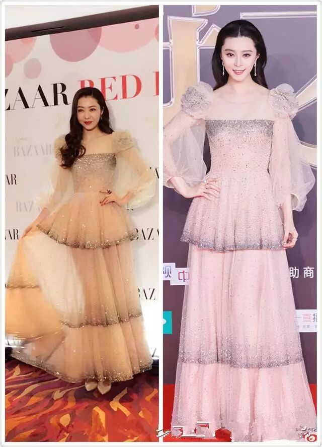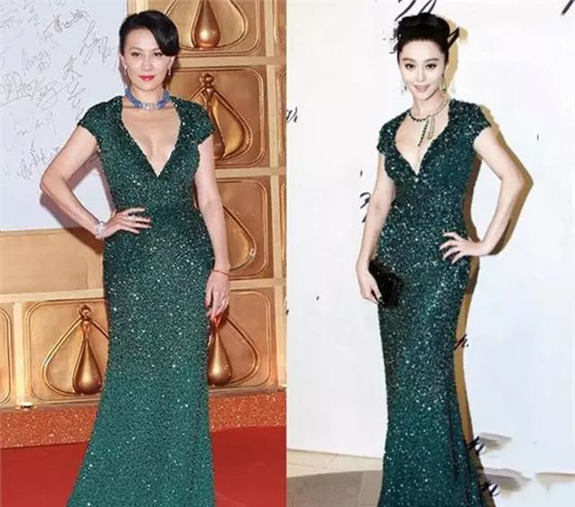 年长却不服老的刘嘉玲除了私服爱撞衫外,晚礼服也不怕,不过同款撞衫范冰冰确实输了一大截。