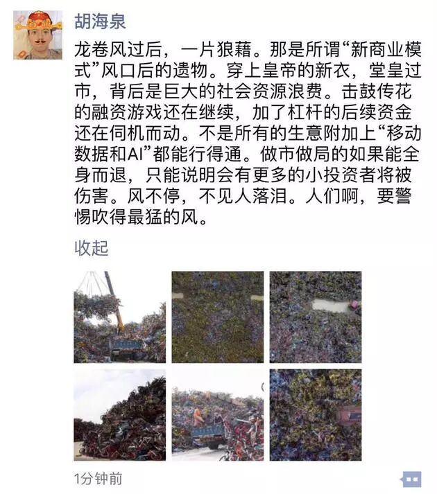 胡海泉发了一组“厦门10万辆共享单车堆积成山”的照片,并配文称“龙卷风过后,一片狼藉。那是所谓‘新商业模式’风口后的遗物。穿上皇帝的新衣,堂皇过市,背后是巨大的社会资源浪费”。他认为现在的单车市场,已经成为了资本的游戏,而且还会有后续玩家入场,他提醒人们要警惕吹得最猛的风。
