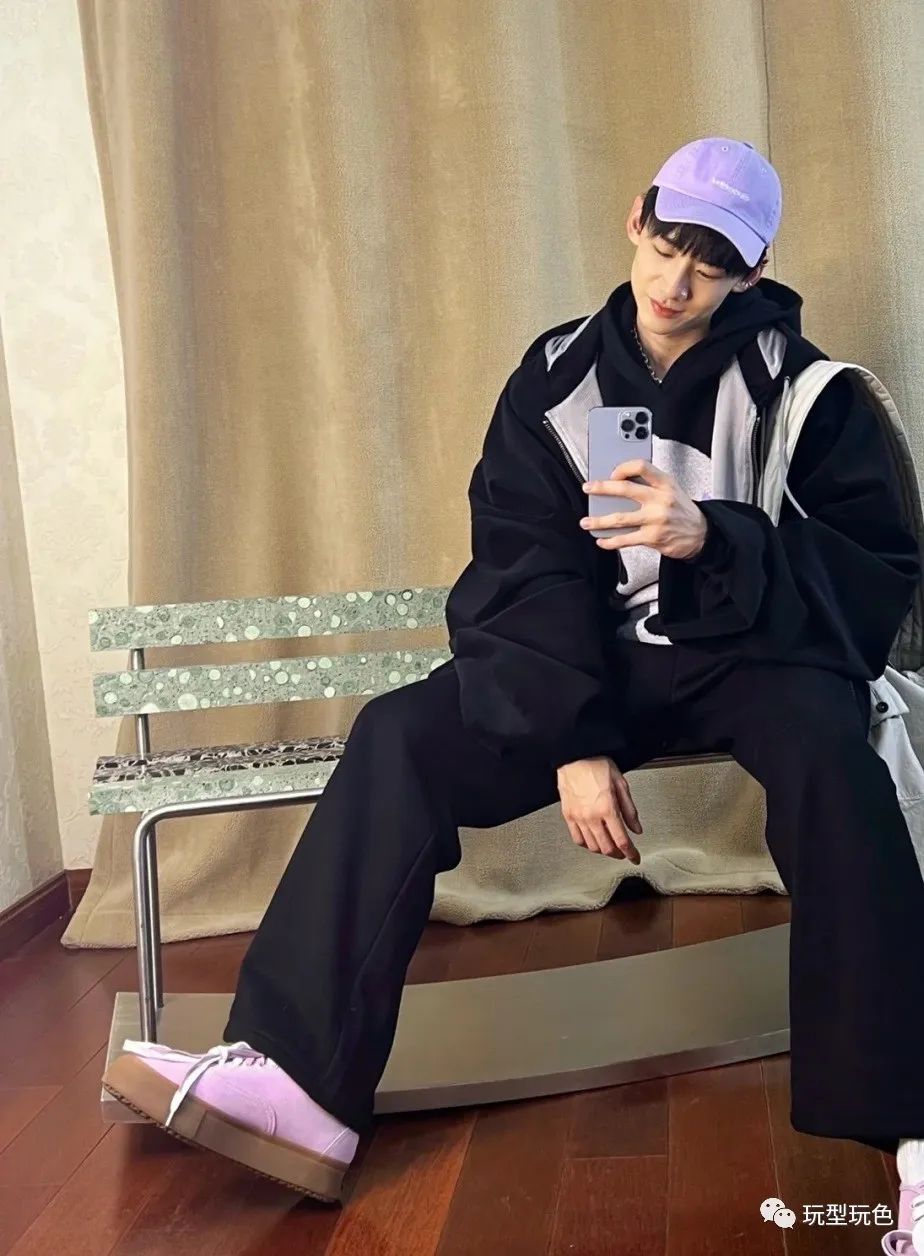 白敬亭的穿搭中鞋子色彩的选色可以说是非常大胆的,紫色、绿色、棕色、白色......