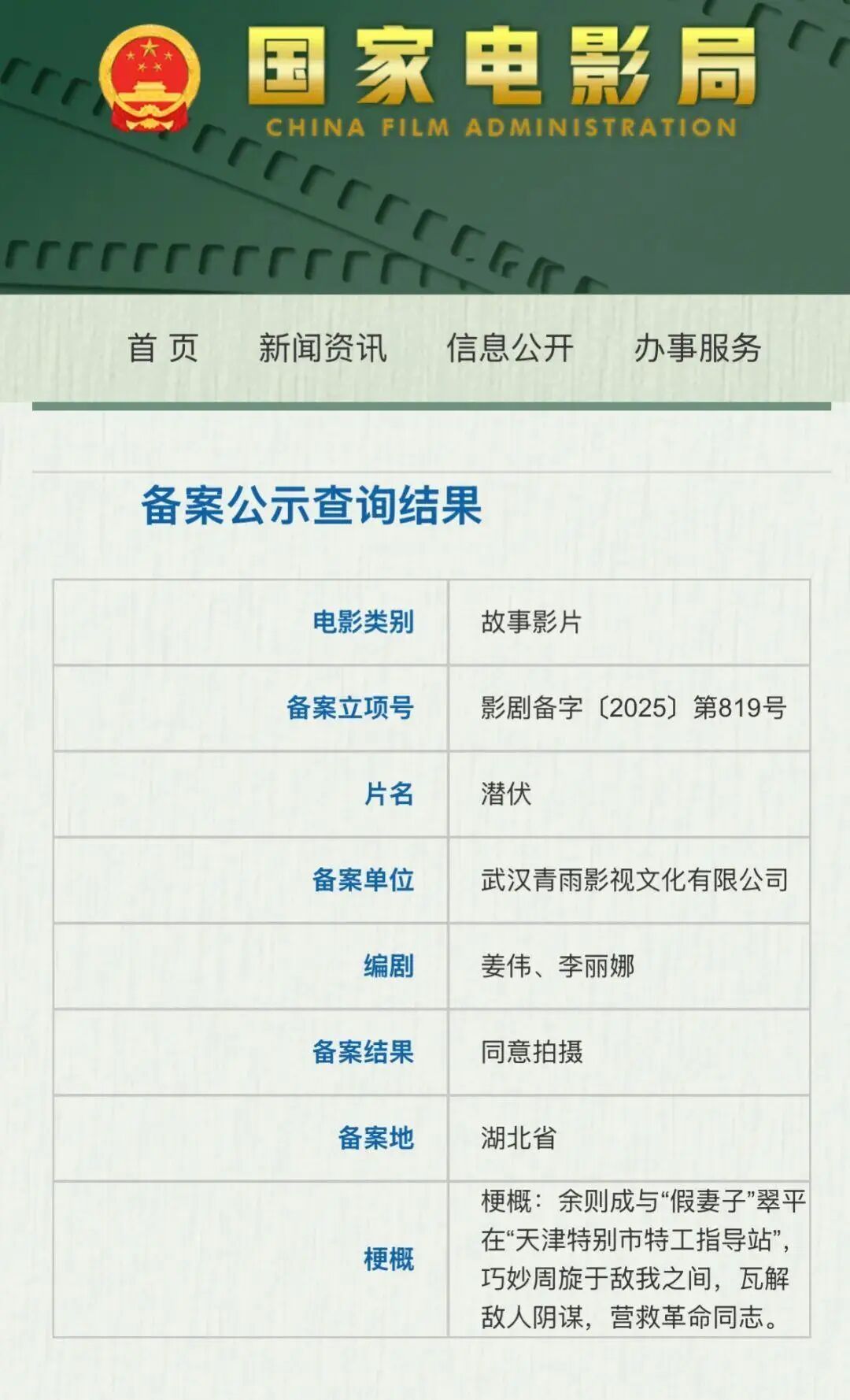据电影频道融媒体中心消息,据国家电影局最新备案、立项公示,电影《潜伏》立项,编剧为姜伟、李丽娜,姜伟为剧版导演、编剧。备案单位为武汉青雨影视文化有限公司。