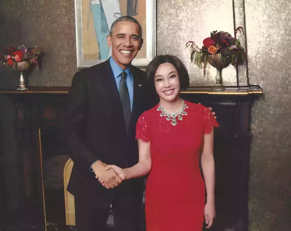 2016年3月18日,国际影星刘晓庆(美之净代言人)在美国与奥巴马合影,美之净的形象大使,意在共同打造健康饮水新潮流。