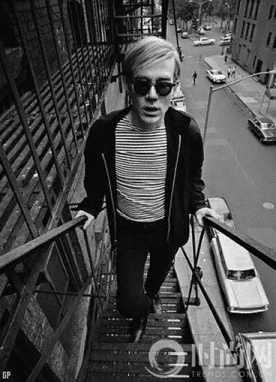 Andy Warhol 是我们最先想到的:无疑,金头发+墨镜+条纹衫+黑色开衫是可以直接和 Andy Warhol 划等号的。