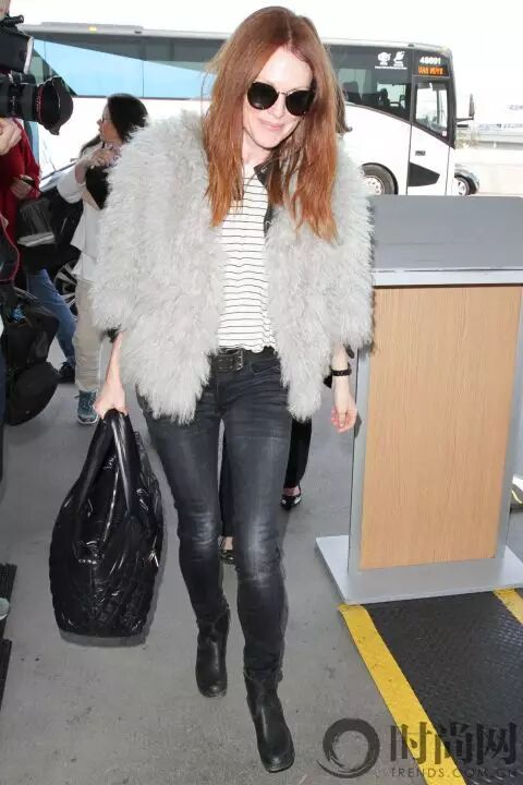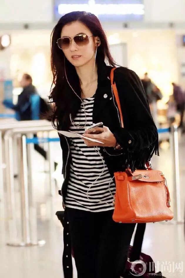张柏芝在机场被拍到,飞行员墨镜+条纹衫+流苏麂皮外套+爱马仕铂金包;