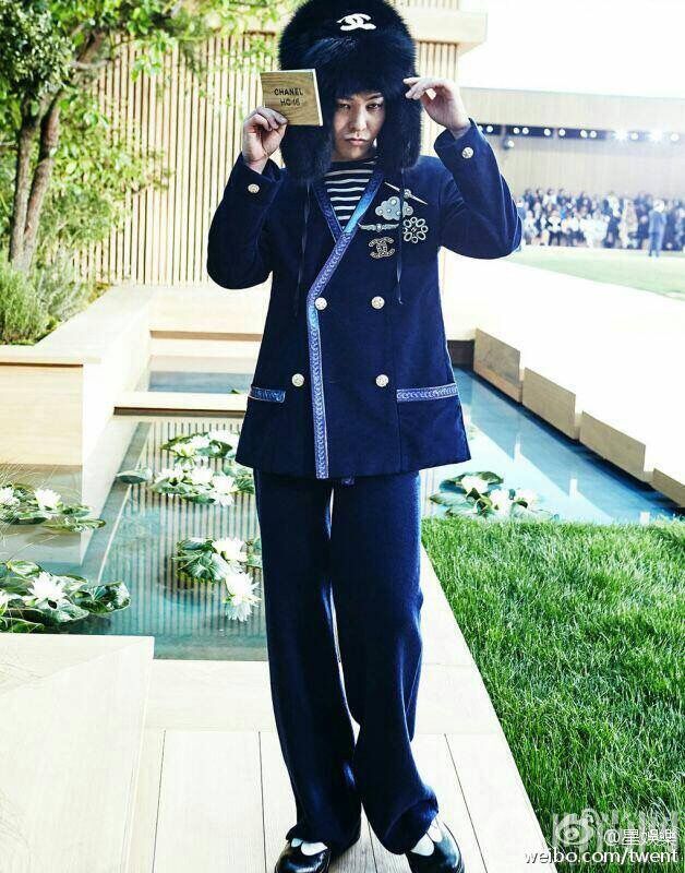 最会穿衣的男神权志龙亮相Chanel 2016高定大秀,雷锋帽+条纹T恤+西装套装;