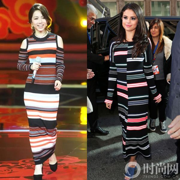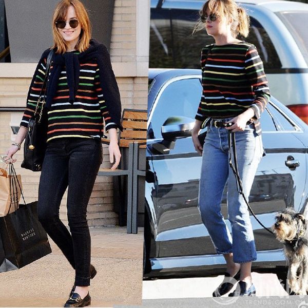 出名的会穿星人达科塔·约翰逊多次穿出这件彩色条纹衫,一点不吝啬自己的喜爱之情。