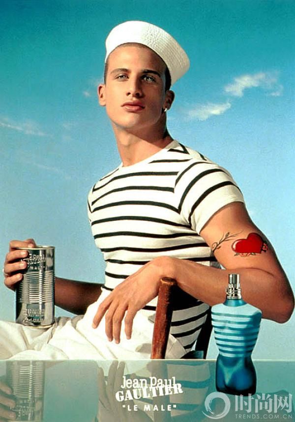 最出名的是1993年推出的条纹瓶身的香水,广告海报上穿着条纹衫、带着海军帽的扮成水手的模特一下子吸引了人们的视线。