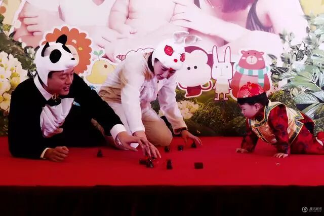 在抓周环节,穿上小唐装的小凌听面对各种寓意的玩偶,机灵搞怪。