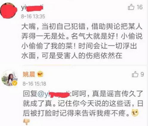当时有网友在微博留言:“大嘴,当初自己犯的错,借助舆论把某人弄得一无是处。名气大就是好!小偷说小偷偷了我的菜!时间会让一切浮出水面,可是受害人的伤疤依然在。”姚晨回复称:“呵呵,真是谣言传久了就成了真。记住你今天说的这些话,日后被打脸时记得来告诉我疼不疼。”