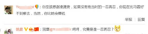 还有网友称:“你应该感谢凌潇肃,如果没有他当时的一忍再忍,你现在比马蓉好不到哪去,当然,你比她会赚钱。”姚晨回复称:“呵呵,究竟是谁一忍再忍?”