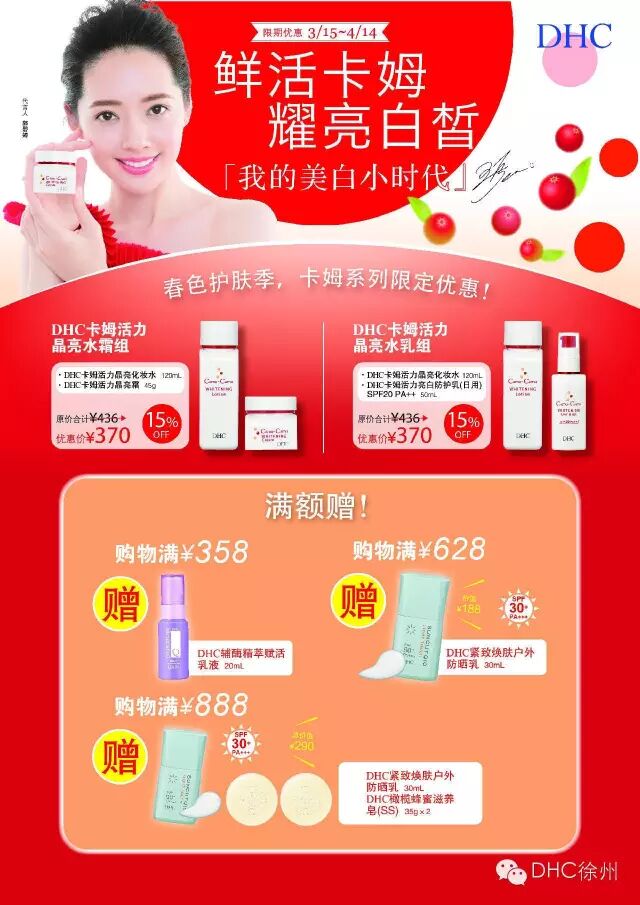 “我觉得美白应该是所有女生最想注重的吧。对我而言,在内地工作气候比较干燥,就会很注意保湿,而DHC卡姆活力晶亮系列就刚好能兼顾这几种需求。因为卡姆果实中含有丰富的天然维C,能淡化已生成的黑色素,改善暗沉。而抗氧化成分多酚,能防止老化。同时满足三种功效自然让人很安心咯。”