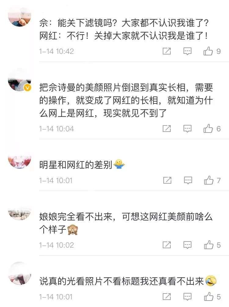 也许这就是网红和明星的区别吧?可能就真的只能是在“网上红”……大概这也是为什么我们很常听说偶遇某某明星,却很难听说偶遇某某网红。真的不得不说滤镜功能太强大了!也难怪粉丝纷纷心疼,说她躲过了时间和岁月,却没躲过*音里网红的滤镜。