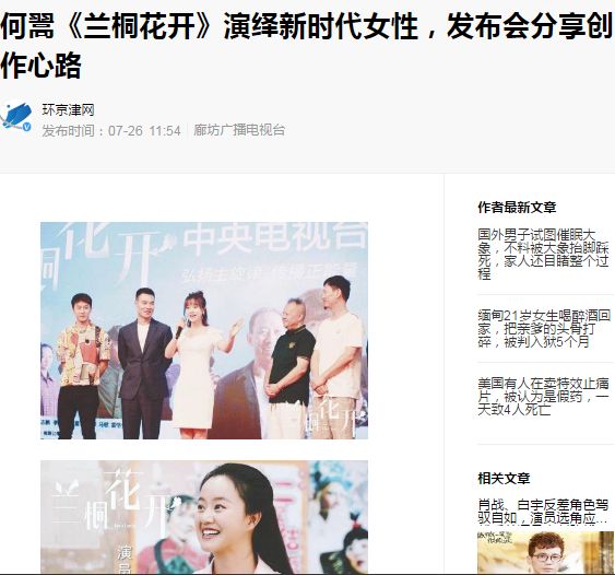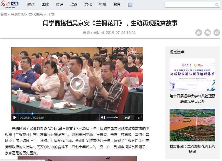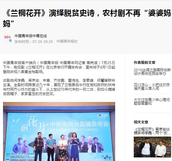 7月25日,由闫学晶、吴京安、来喜、 雷恪生等演员领衔主演,中央电视台、陕西西咸新区秦汉新城影视发展有限公司、金色艳阳文化传媒(北京)有限公司、怡光国际经济文化集团有限公司联合出品的大型农村脱贫攻坚题材电视剧《兰桐花开》在北京举行首播发布会。宣布将于8月1日起登陆央视八套黄金档剧场,并与现场媒体分享了剧中的人物关系以及精彩看点。作为深刻反映当代农民脱贫致富历程的优秀作品,《兰桐花开》的开播备受关注。新京报、环京津网、人民网、光明网、中国新闻网、中国经济网、中国青年报、陕西电视台等多家媒体第一时间进行了相关报道。