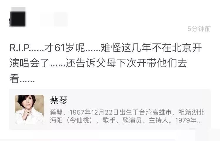 星期天深夜,微信聊天群里悄然流传:蔡琴死了。