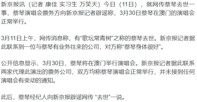隔了13个小时,《新京报》去蔡琴的经纪处求证,经纪人断然否认。