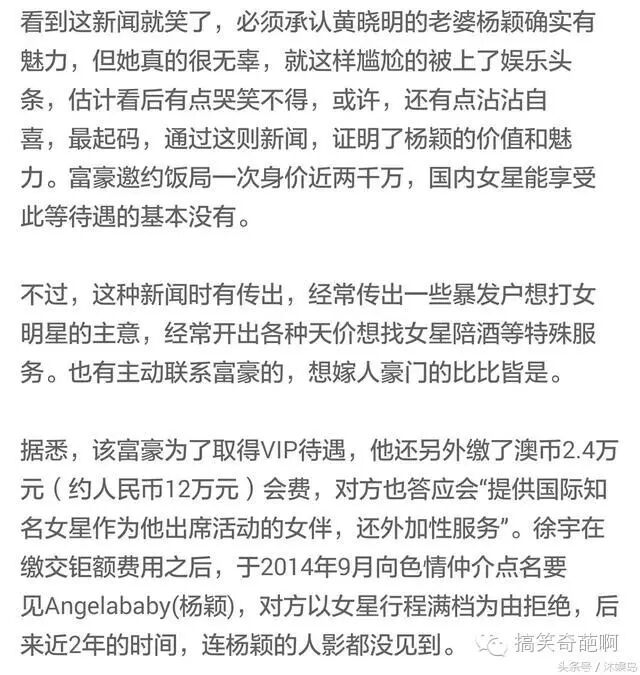 那么,问题来了,这么红透半边天,肯定惹眼。近日,台湾媒体爆出,有富商徐某缴了约人民币12万元会费,成为某机构会员,对方将提供知名明星会面和服务。该富商此后还砸澳币370万元(约合1800万元人民币),向该援交机构请求安排和杨颖单独会面,并要求提供X服务。但如今2年过去了,徐某连杨颖一面都没有见到,简直被气炸了,才感觉被骗并告上法院,提出要索赔1800万。