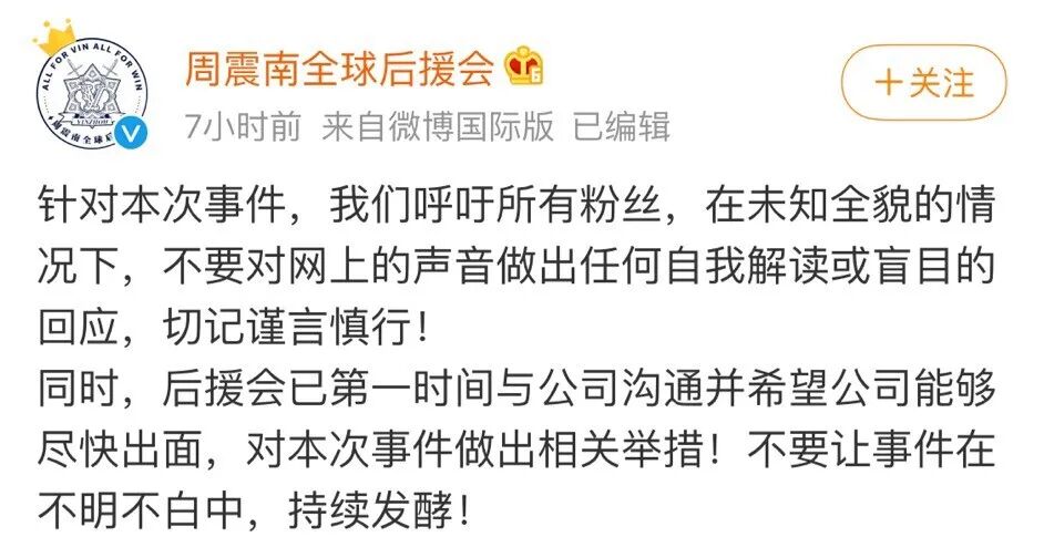 随后,周震南全球后援会称已与公司沟通,并希望其能尽快出面,做出相关举措,不要让事件在不明不白中持续发酵!周震南的粉丝也纷纷出面控评,周震南父亲的公司和哇唧唧哇也相继发出声明,周震南父亲公司称已在与各方积极协调处理,从未逃避自身应承担的义务和责任。