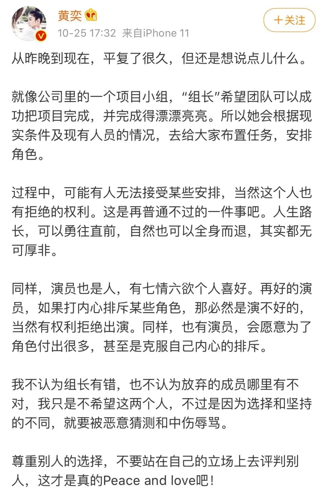 在新一期演员综艺中,唐一菲被黄奕挑选出演《回家的诱惑》中的艾莉,之后唐一菲放弃出演并退赛,引发热议。25日,黄奕发文回应,称自己是希望把项目完成得漂亮,直言演员也是人,如果打内心排斥某些角色也会演不好,有权力拒绝,双方都没错,只是坚持不同,呼吁不要站在自己的立场上去评判别人。