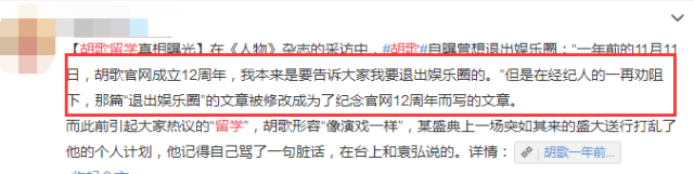 在去年的11月份,胡歌一开始的想法是退出娱乐圈,但是在经纪人的劝阻下变成了纪念12周年。