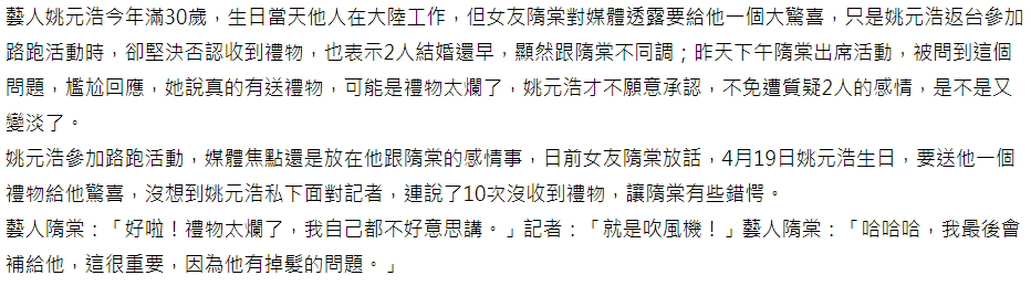 2011年4月,姚元浩因为夜店玩乐到凌晨,不仅没跟隋棠报备还被拍到送辣妹回家,两人因此发生激烈争吵。媒体报道这次姚元浩是直接被赶出家门的。