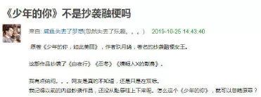 尤其是刚上映,原著作者玖月晞就被爆“抄袭融梗女王”,不少看过剧的观众表示这部《少年的你》剧情大纲抄袭了《白夜行》,男女主人设、剧情走向几乎一样,结局抄袭了《嫌疑人X的献身》,校园暴力桥段搬运了《恶意》,而个别部分融梗国内作者的《忍冬》。
