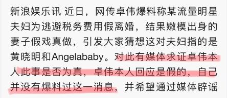 这一爆料被指说的就是黄晓明AB,但媒体向爆料者求证此事时,对方直接否认了,说是假的,没有爆料过这一消息。
