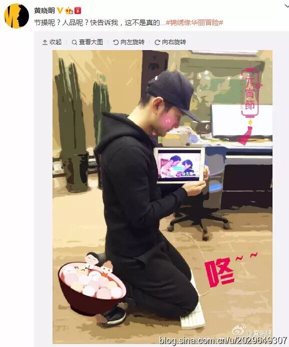 今年3月,黄晓明通过微博发布了自己跪键盘的搞怪照。他留言称,“节操呢?人品呢?快告诉我,这不是真的”。照片中,黄晓明抱着一部ipad跪在键盘上,ipad中播放的是他与陈乔恩的新剧,而画面是两人的亲密戏。3月3日时,黄晓明女友angelababy曾在微博发布两张男友与陈乔恩演亲密戏的剧照,并直言考虑让男友跪搓衣板,看来女汉子果然不留情。网友看到微博后纷纷留言,网友调侃道,“baby说了,这就是真的”、“键盘太小了,差评”、“哈哈哈,被罚了”、“我主张的跪键盘生效了,恩爱哦”。